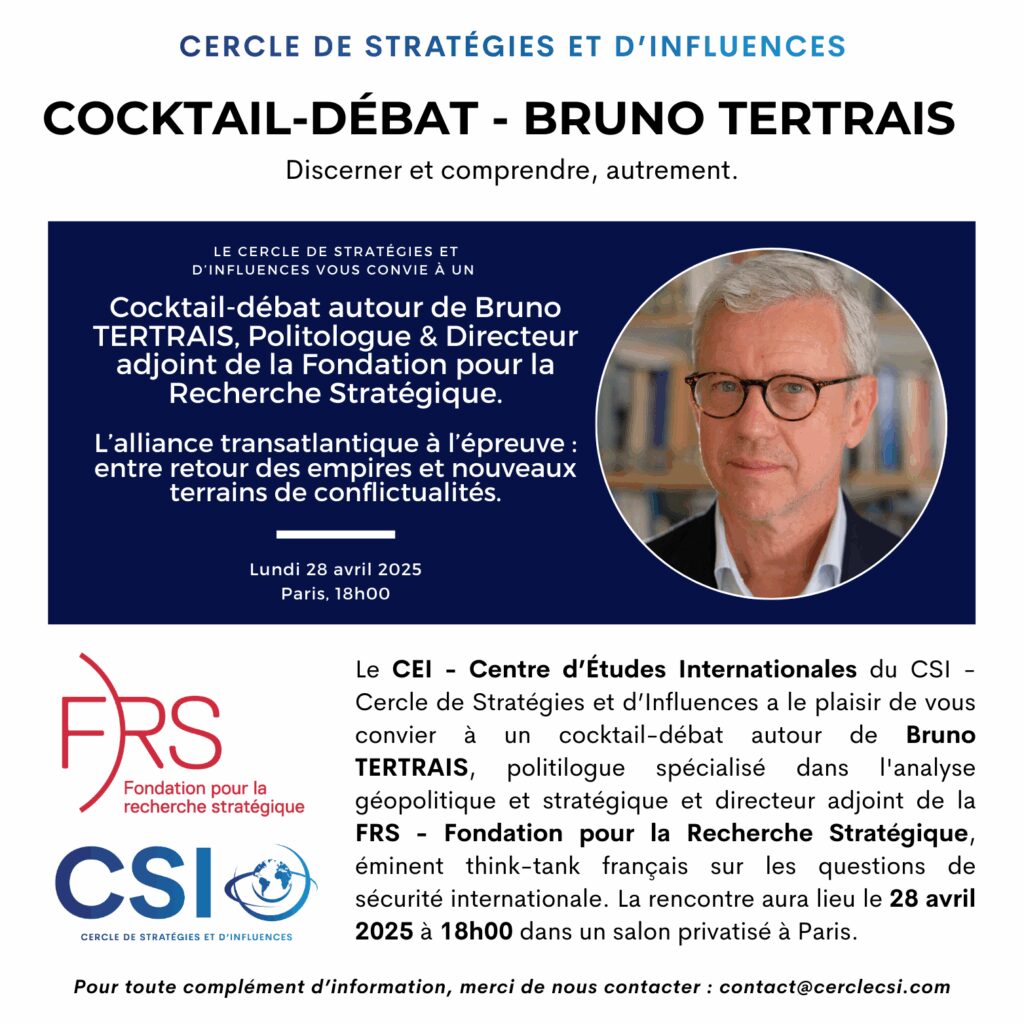 Le CEI – Centre d’Études Internationales du CSI – Cercle de Stratégies et d’Influences a le plaisir de vous convier à un cocktail-débat autour de Bruno TERTRAIS, directeur adjoint de la FRS | Fondation pour la recherche stratégique, éminent think-tank français sur les questions de sécurité internationale, et expert en géopolitique, relations internationales et démographie associé à l’Institut Montaigne. La rencontre aura lieu le 28 avril 2025 à 18h00 dans un salon privatisé à Paris.