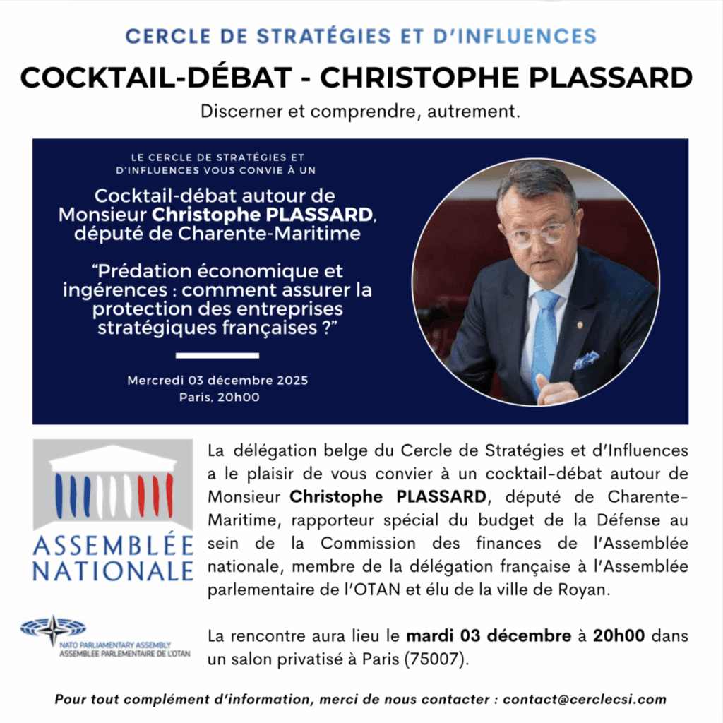 Le CSI – Cercle de Stratégies et d’Influences a le plaisir de vous convier le mercredi 3 décembre à un cocktail-débat autour de Monsieur Christophe PLASSARD, député de Charente-Maritime, rapporteur spécial du budget de la Défense au sein de la Commission des finances de l’Assemblée nationale, membre de la délégation française à l’Assemblée parlementaire de l’OTAN et élu de la Ville de Royan.