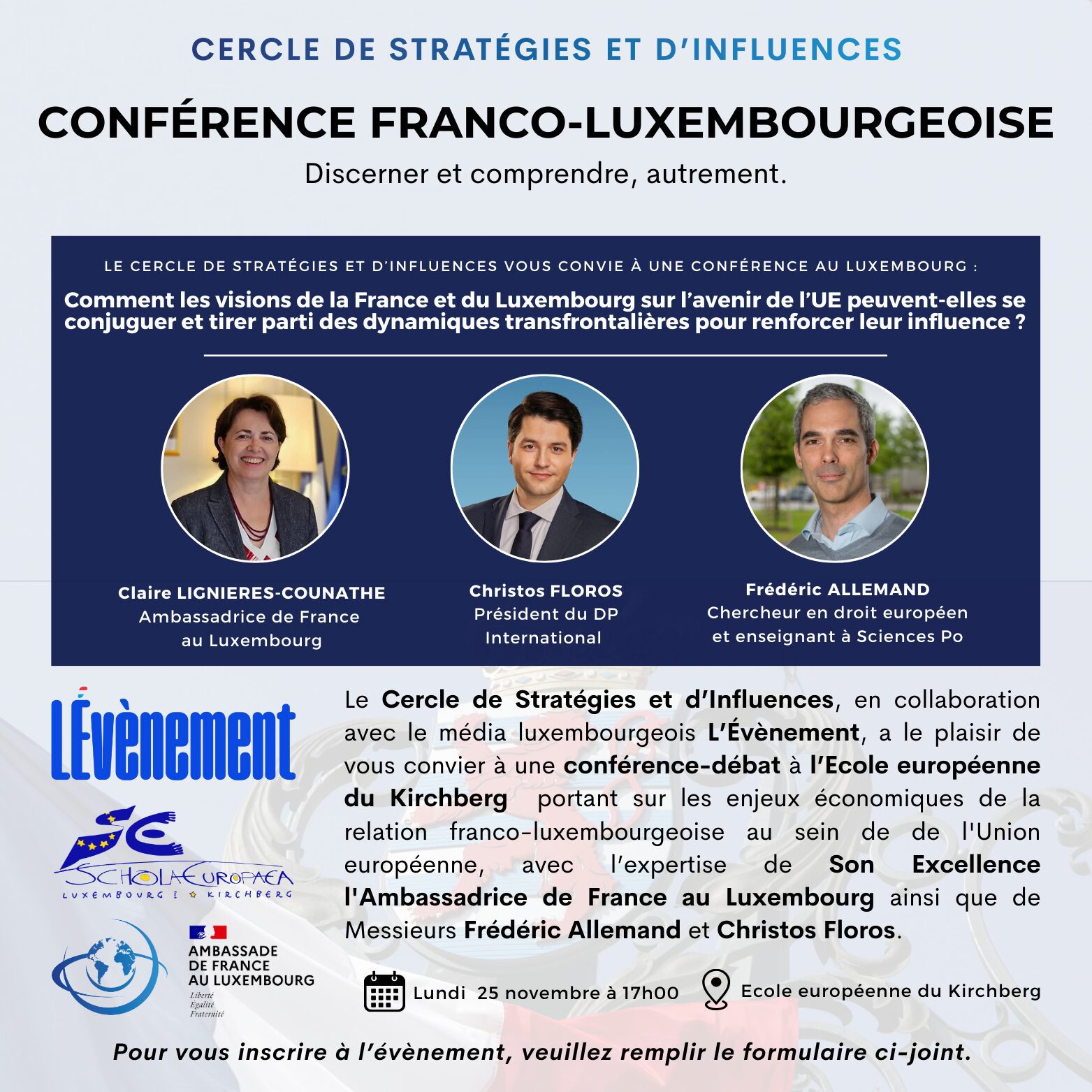 Châleureux remerciements à nos partenaires de L’Évènement pour la co-organisation de cette première rencontre franco-luxembourgeoise, ainsi qu’à Martin Wedel, Directeur de l’École européenne du Kirchberg, pour sa collaboration et son accueil de l’événement.