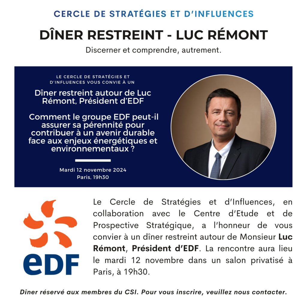 En collaboration avec nos partenaires du CEPS – Centre d’étude et de prospective stratégique, nous avons eu le plaisir de recevoir le mardi 12 novembre, à l’occasion d’un dîner restreint, Monsieur Luc Rémont, Président-Directeur général du groupe EDF.