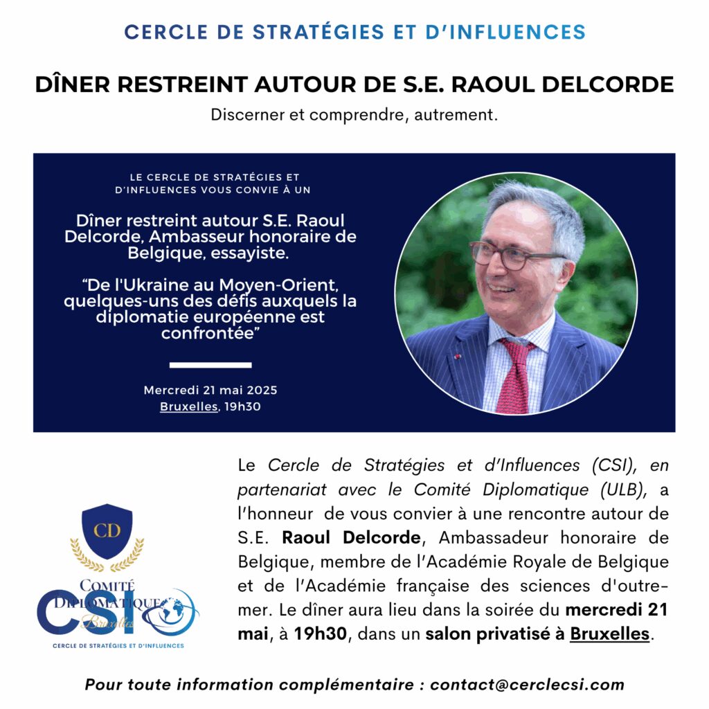 Le mercredi 21 mai, nous aurons le plaisir de vous convier à un dîner restreint à Bruxelles autour de S.E. Raoul Delcorde, Ambassadeur honoraire de Belgique, membre de l’Académie Royale de Belgique, de l’Académie française des sciences d’outre-mer, également professeur de relations internationales et essayiste.