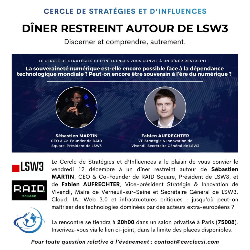 Inscription obligatoire – les places étant limitées, inscrivez-vous dès maintenant : https://www.helloasso.com/associations/cercle-de-strategies-et-d-influences/evenements/diner-restreint-souverainete-numerique-et-dependance